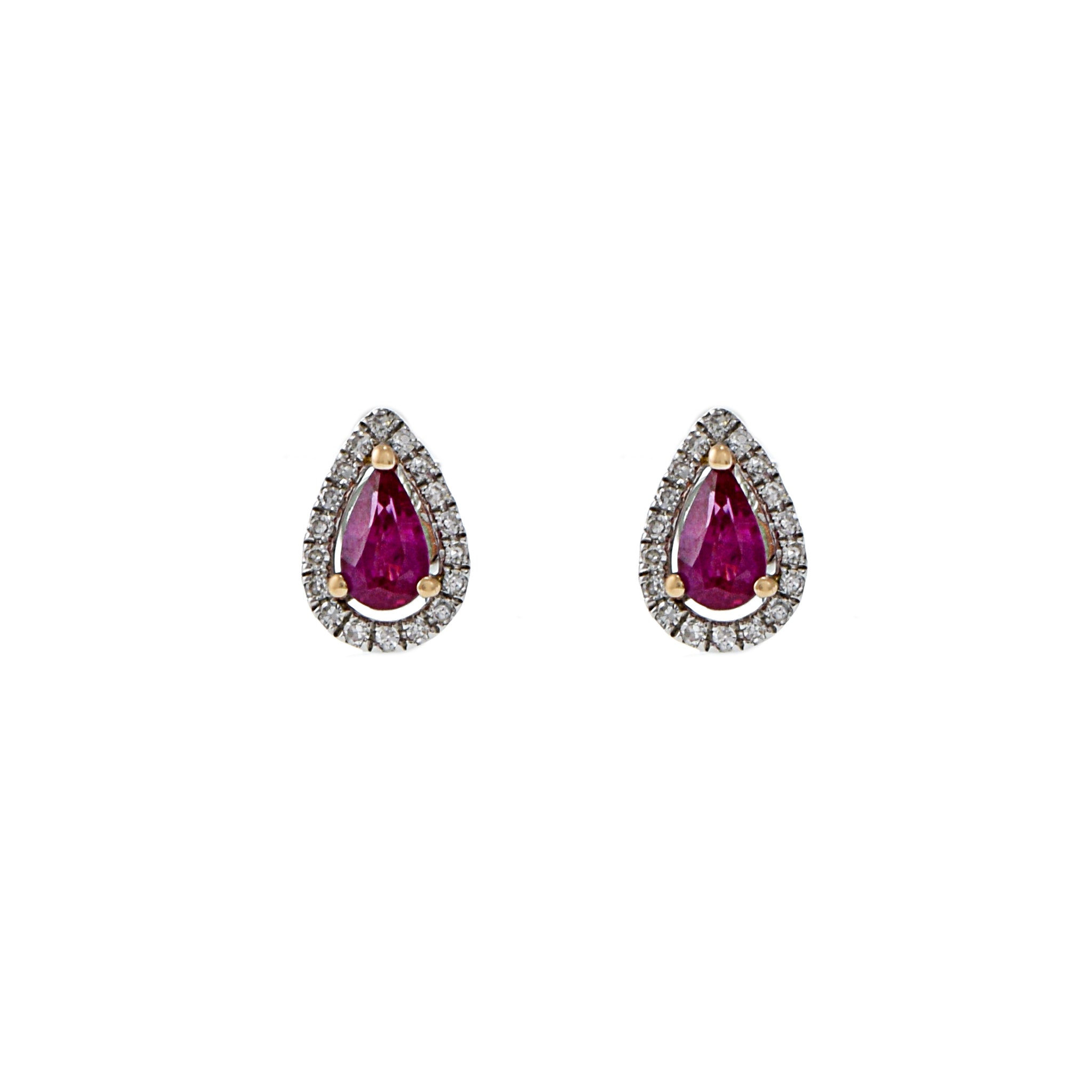 14KT white gold earrings consisting of 0.45CT-TW pear cut rubies and 0.10CT-TW round brilliant cut diamonds. A stunning combination of ruby and diamond accents in shimmering 14KT white gold, perfectly balancing an eye-catching sparkle with classic elegance.