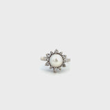 Vintage 14KT White Gold 7.8MM Genuine White Pearl And Diamond Ring