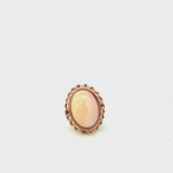 This vintage 14KT rose gold ring is a rare find, featuring a delicate angel skin coral stone set in a beautifully intricate filigree bezel. The rose gold complements the soft pink tones of the coral, creating a warm and feminine look. The ring's filigree detailing adds a vintage feel to the piece, creating a romantic and elegant look. The ring's subtle beauty is perfect for those who appreciate understated sophistication and natural materials. The coral stone has a unique beauty and will add a touch of whimsy to any outfit. This ring is a timeless piece that will be treasured for years to come.