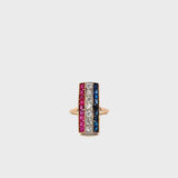 This Art Deco cocktail ring from the Vintage collection is crafted in 14KT rose gold and features a rectangular design with a stunning combination of rubies, blue sapphires, and diamonds. The ring showcases a total of 3.00 carats of gemstones, including 1.00 carat of rubies, 1.00 carat of blue sapphires, and 1.00 carat of old European cut diamonds. The gemstones are intricately arranged in a geometric pattern, creating a striking contrast against the warm tones of the rose gold band. The ring has an elegant and timeless design that is sure to make a statement on any occasion.