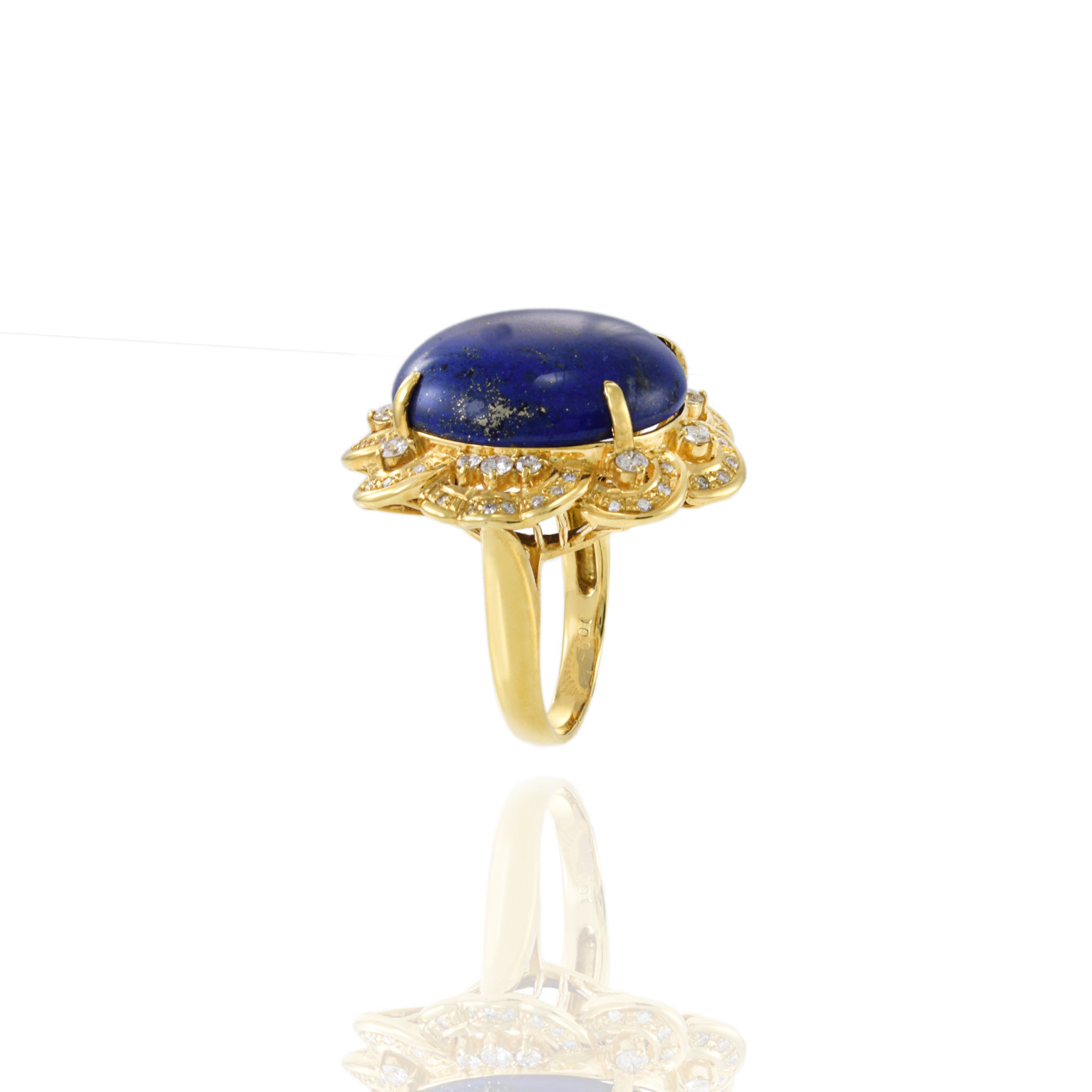 Introducing the Vintage Retro Era 18KT Yellow Gold Lapis Lazuli and Diamond Cocktail Ring. This stunning ring features a central cabochon cut natural lapis lazuli weighing 23.16 carats, surrounded by a round cut diamonds totaling 0.87 carats G color VS1-VS2 Clarity.